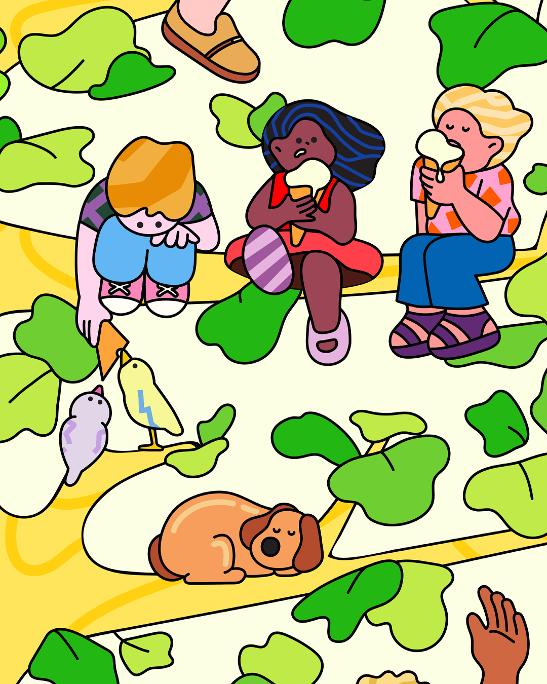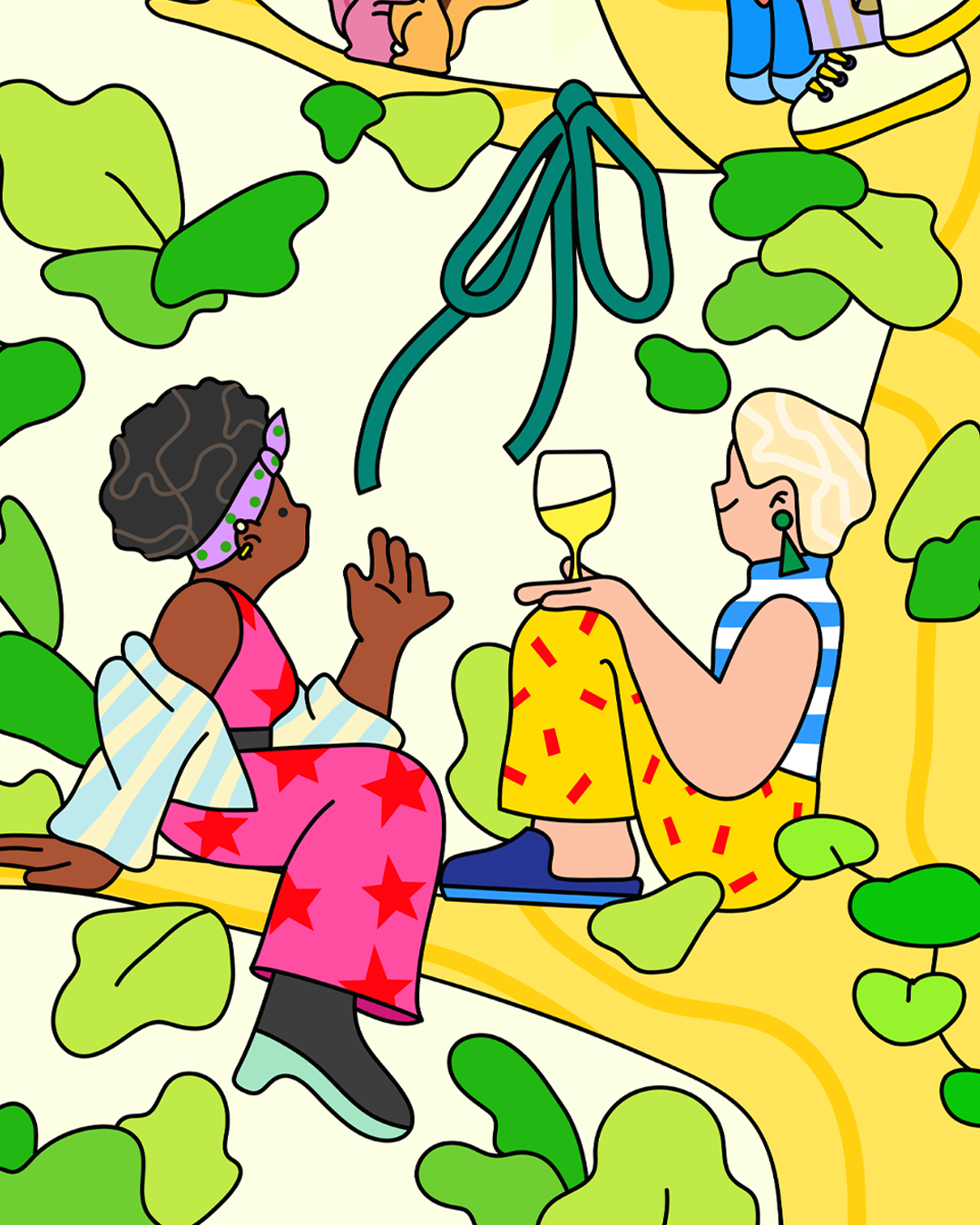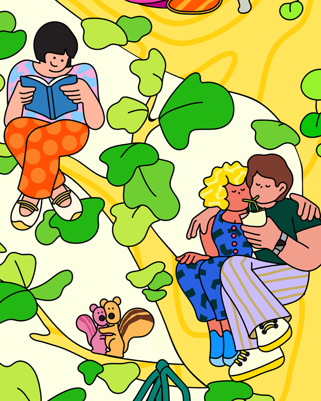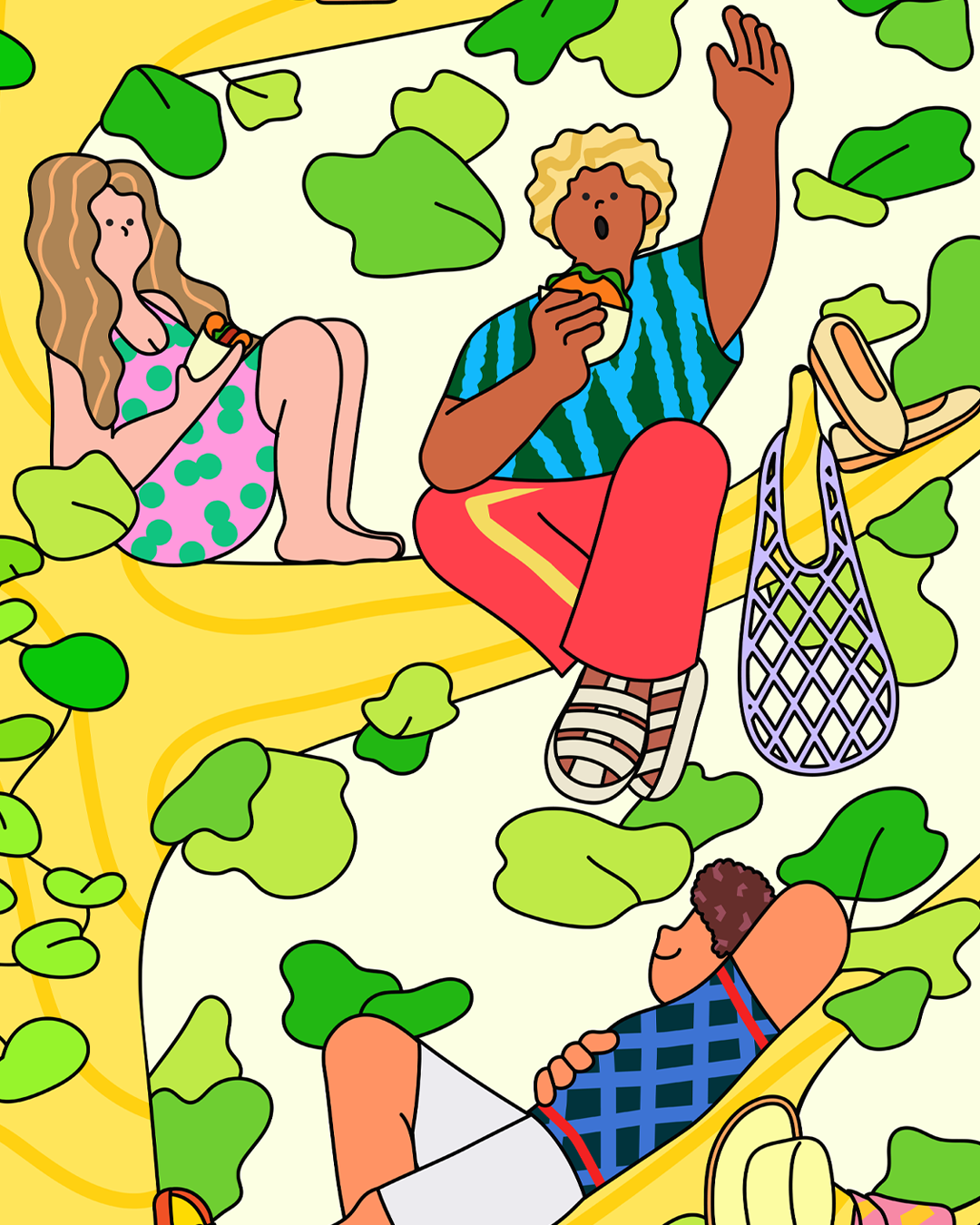 The illustration depicts a scene where people enjoy Shake Shack food and spend happy moments together on a large tree.